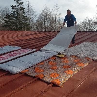 男性従業員部屋(相部屋)。12畳の広さですが、シーツなどの洗濯物乾燥室を兼ねています。
