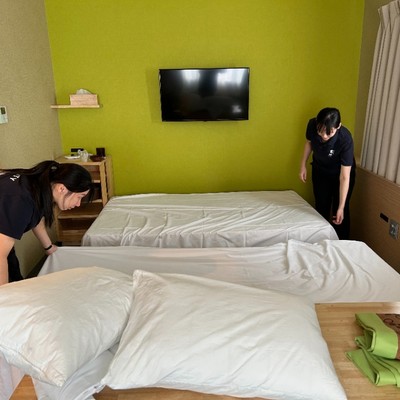 客室清掃では、主にお布団の上げ下げ、水回りの清掃、お部屋のセット等です。限られた時間内に清掃を完了させる必要がある為、テキパキ動く必要がございます。最初は複数人で対応、慣れてきたらお一人で対応いただきます!