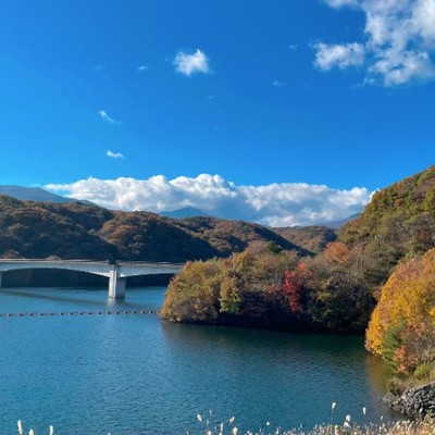 那須連峰の山並みが湖面に映える、あたたかみのあるダム。