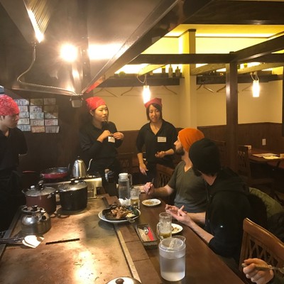 <接客風景>配膳が終わり食事中のお客様との自己紹介などから始める英会話。上手く話せなかった場合には終了後に調べて翌日新しい出会いの場(接客)で試してみて覚えていく。通じれば楽しくなること間違いなし。。この時間を楽しみに再来店されるお客様多数。