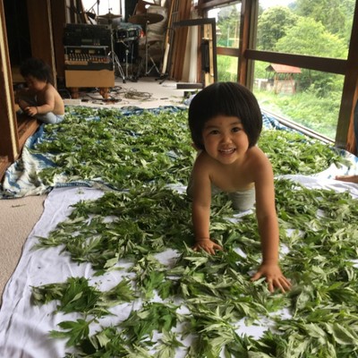 ■興味ある人には、この辺の山で採れた山菜野草薬草(ヨモギ、スギナ、ホップ、ドクダミ、キハダ)を干した自家製の薬草茶を飲んでいただきます。山の天然水を使うからうまい。